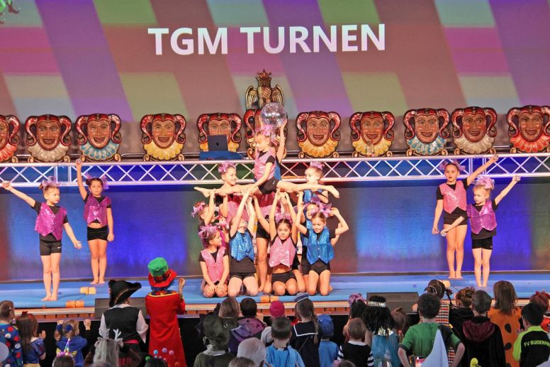 Mit viel Charme und Fantasie entführte die Haubengarde die Zuschauer in die Welt der „Greatest Showkids“. Die Gruppe unter der Leitung von Nadine Mirasolo überzeugte mit einer farbenfrohen Choreografie. Einen Ausflug in die Musik- und Tanzwelt der 90er Jahre boten die Fit Kids, trainiert von Jaqueline Köppl, und sorgten für beste Stimmung im Saal.