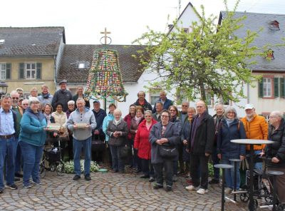 Traditionelles Aufstellen der bunten Eierkrone am Kirchplatz mit der Kolpingfamilie Winkel